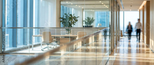 Modern Corporate Hallway with Glass Walls and Motion Blur of Walking People