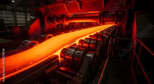 Hot steel sheet rolling process in heavy industrial factory with glowing metal under high temperature machinery
