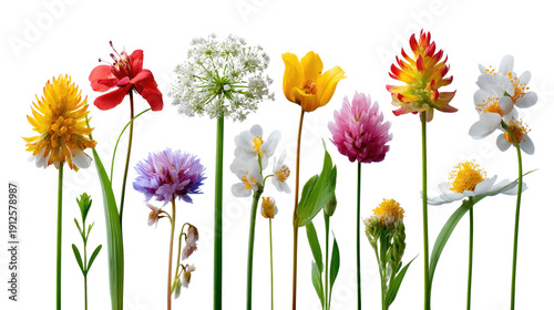 Floral Symphony: A vibrant array of diverse flowers, each showcasing its unique beauty, stands tall in a row, a visual poem of nature's artistry.