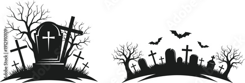 Spooky Halloween Cemetery Silhouette Set with Tombstones Gravestones Dead Trees and Bats for Gothic Horror Design Vector Illustration Isolated on White.