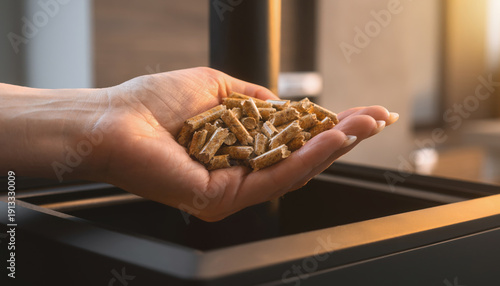Hand holding wood pellets for eco-friendly heating concept