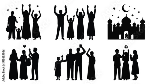 Eid ul fitr celebration silhouettes with joyful muslim families and mosque at night