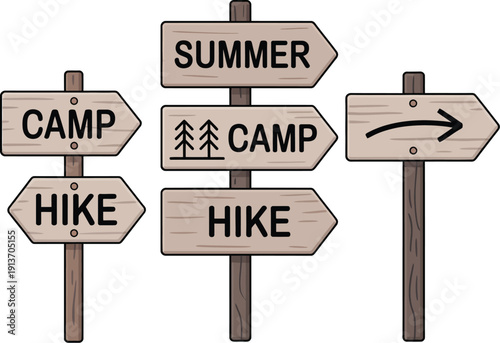 Wooden Signs Pointing to Camp and Hike with Summer Direction