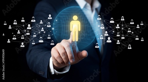 A business professionals hand touches a glowing yellow human icon within a digital globe representing a global network of connections