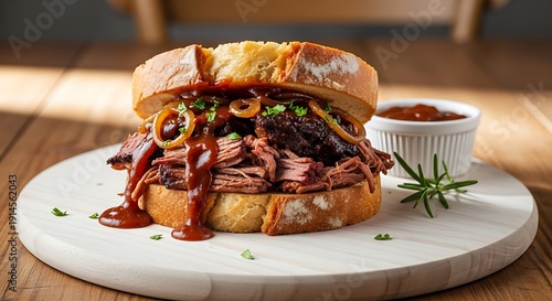 Delicious barbecue pulled pork sandwich with tangy coleslaw on a wooden board. braised brisket