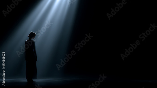 A solitary figure bathed in a dramatic spotlight, against a backdrop of deep shadows