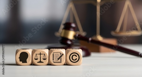 Law and justice symbols on wooden blocks with gavel in background