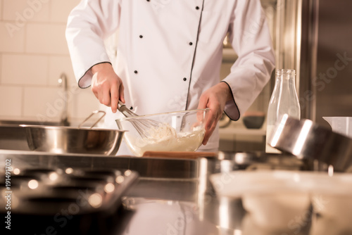 partial view of confectioner with whisk making dough in restaurant kitchen