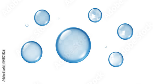 Several transparent blue bubbles floating on pure transparent background