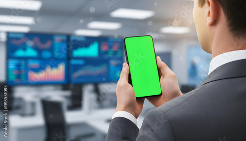 Hand holding mobile smartphone with blank green screen mockup for finance app. Businessman in office analyzing stock market trading charts on digital data display screens.