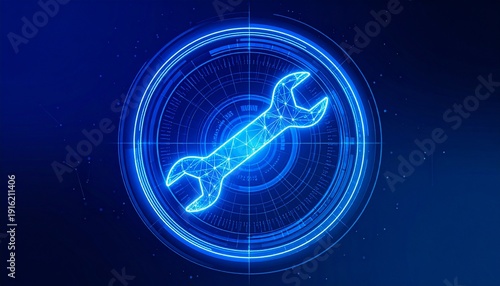 A futuristic, digital wrench icon against a blue background, perfect for tech or repair themes. The wrench is designed with neon glowing lines