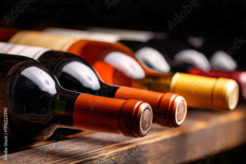 Unlabeled wine bottles rest on a dark wooden shelf in a low-angle shot with warm lighting, showcasing their smooth surfaces and unique design