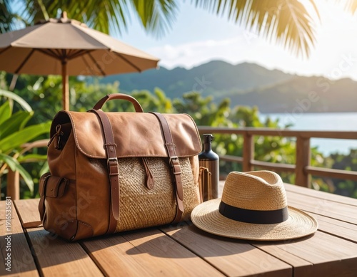 Travel bag with hat and water bottle on wooden deck overlooking tropical landscape with mountains and lake at sunset or sunrise