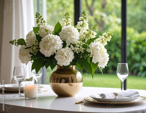 Elegant floral arrangement of white hydrangeas and lilies in a stylish gold vase on a dining table with glassware and candles, overlooking a lush green outdoor scene