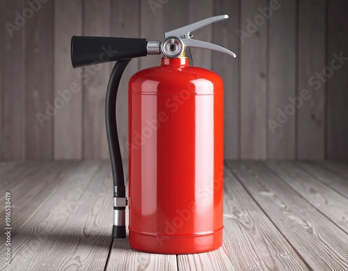Fire extinguisher with a black hose and nozzle placed on wooden floor against a wooden wall background for safety and emergency preparedness