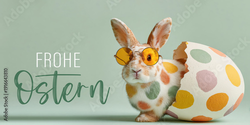 Frohe Ostern Konzept, Ferien Feiertag Grußkarte, Karte mit deutschem Text - Lustiger Osterhase mit Sonnenbrille und bunten Ostereier, isoliert auf grünem Hintergrund