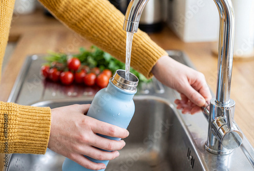 Hands filling a reusable water bottle from a kitchen faucet. Concept of sustainability and everyday hydration.