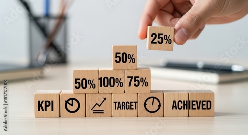 Wooden cubes showing KPI progress being placed manually with shallow focus and minimal desk background gently blurred.