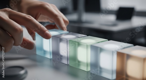 Workflow expansion cubes aligned manually using shallow focus and subtle neutral blurred environment.