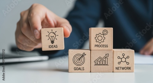 #1927841258Mentorship and coaching and elevating one cube slightly using wooden cubes, symbolic icons, human hand, natural depth of field, soft blurred background, minimal desk background.