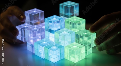 Innovation architecture cubes arranged manually using crisp focus and subtly faded background.