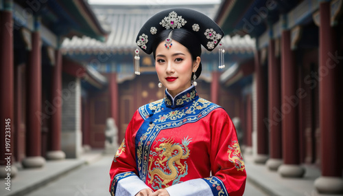 Elegant Lady in Traditional Attire: A regal woman adorned in intricate traditional clothing stands confidently in an ancient building.