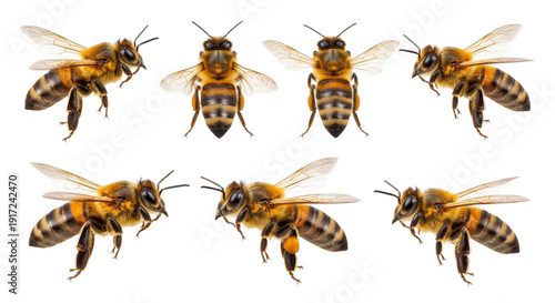 Six realistic honey bees flying in different poses isolated on transparent background, insect macro photography