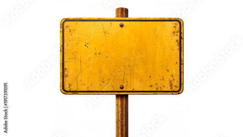Empty yellow sign positioned on a rusty metal pole isolated on transparent background