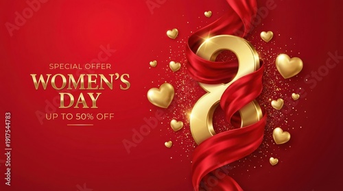 International Womens Day Special Offer with Golden Number 8 and Red Silk Ribbons.