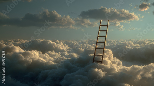 A ladder is seen in the clouds, with the sky above it being mostly cloudy. The ladder is tall and he is reaching for the sky. The scene gives off a sense of adventure and possibility