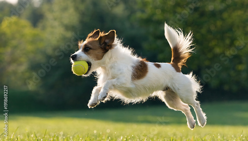 Playful Jack Russell Terrier Catching Yellow Tennis Ball in Sunny Park