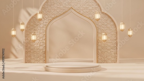 Minimal 3D Ramadan stage with mosque arch and soft lantern glow. Beige and gold tones with modern Islamic aesthetic, perfect for product mockups and social media visuals.