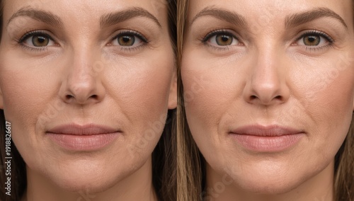 A detailed image of a woman before and after facial rejuvenation, including chin reshaping, neck liposuction, and fillers in the cheeks and chin. Outcome of the treatment in