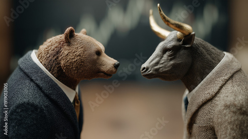 The Confrontation: A powerful image symbolizing the dichotomy of the financial world, as a formidable bull and a bearish bear stand face-to-face, embodying market forces and investment strategy.