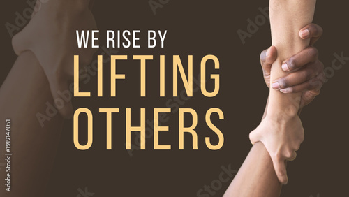 Hands clasped together with inspirational quote 'We rise by lifting others' in a supportive gesture on a dark background.