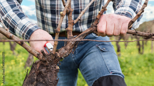 Close-up of the hands of the winemaker pruning the vineyard with professional steel scissors. Traditional agriculture. Winter pruning, Guyot method.