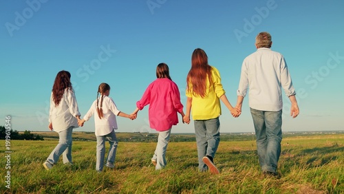 Kids, dad mom walking together in field. Happy family, parents children playing outdoors. Family picnic in nature. Concept of good family relationship. Group people in nature. Family trip in nature
