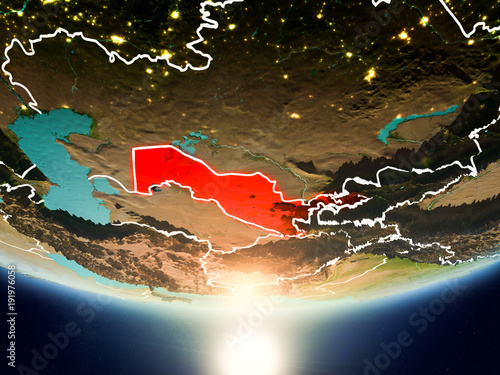 Uzbekistan with sun on planet Earth