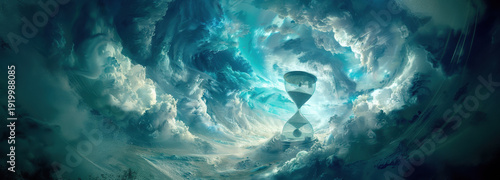 striking hourglass suspended in a swirling vortex of clouds, symbolizing the relentless passage of time and its profound influence on destiny.