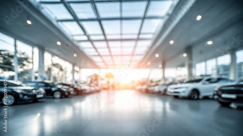 Blurred Interior dealership store banner , car park indoor building showroom , car sales , auto leasing, insurance, rental theme