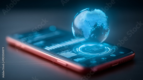 Smartphone with holographic globe and dashboard representing global connectivity and mobile analytics concept.