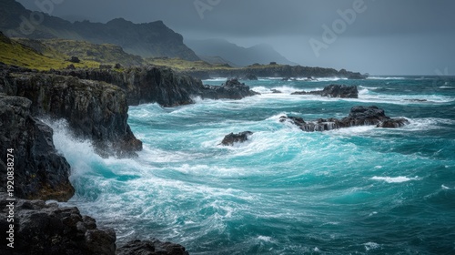 Waves hit the rugged cliffs along the coastline. The ocean shows deep blue colors while clouds cover the sky. The scene captures the beauty of nature and movement of water.