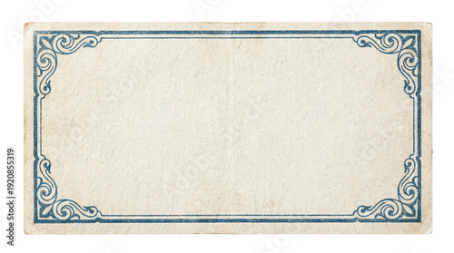 Vintage blank paper card with an ornate decorative blue frame, old retro label on a transparent background.