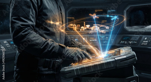 Person in space suit operating holographic control panel displaying lunar base and satellite diagrams