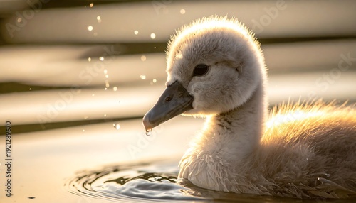 A fluffy baby swan cygnet swims on a lake bathed in golden light, water droplets glisten near its beak