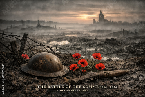 Battle of the Somme 110th anniversary commemorative battlefield landscape with rusted British Brodie helmet barbed wire remembrance poppies trench silhouettes 1916 Great War