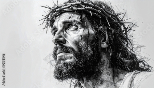 Retrato de Jesucristo con corona de espinas en dibujo de carboncillo sobre fondo blanco con amplio espacio negativo. Concepto de fe, espiritualidad y arte religioso.
