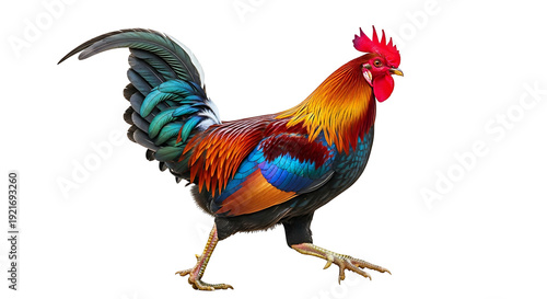 Colorful Rooster Standing on White Background.