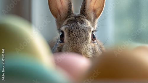 Curious young rabbit looks directly at camera with colorful easter eggs in soft focus foreground.