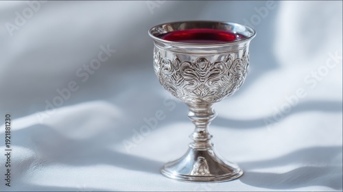 Silver Kiddush Cup Filled With Red Wine on White Cloth With Candle Flame Reflection in Silver Goblet During a Festive Occasion